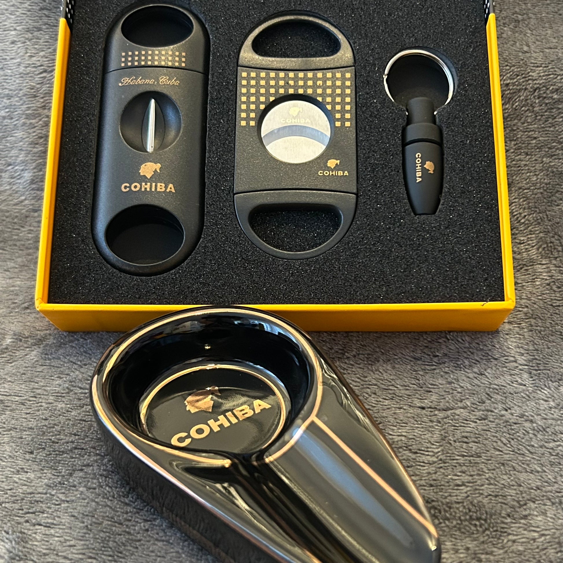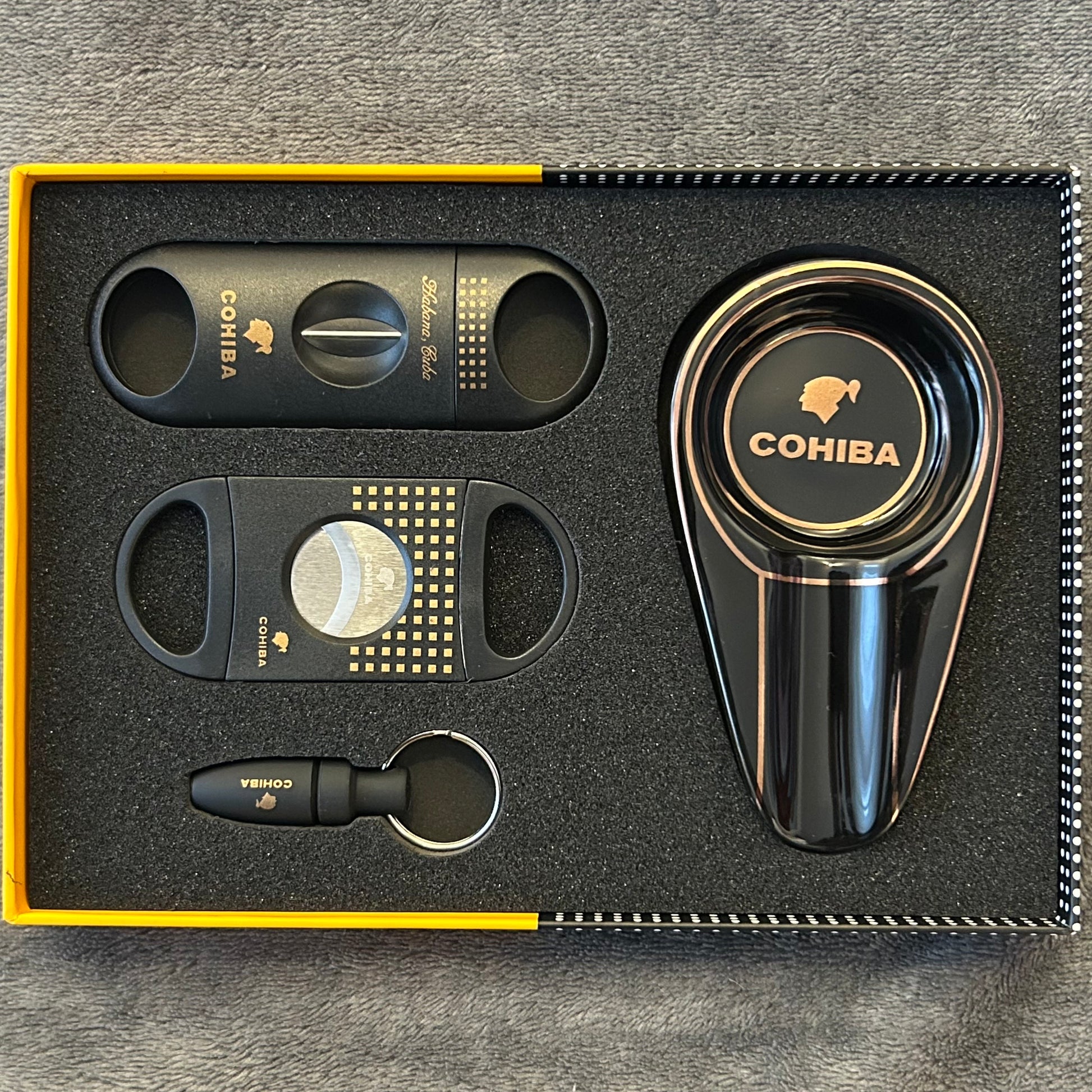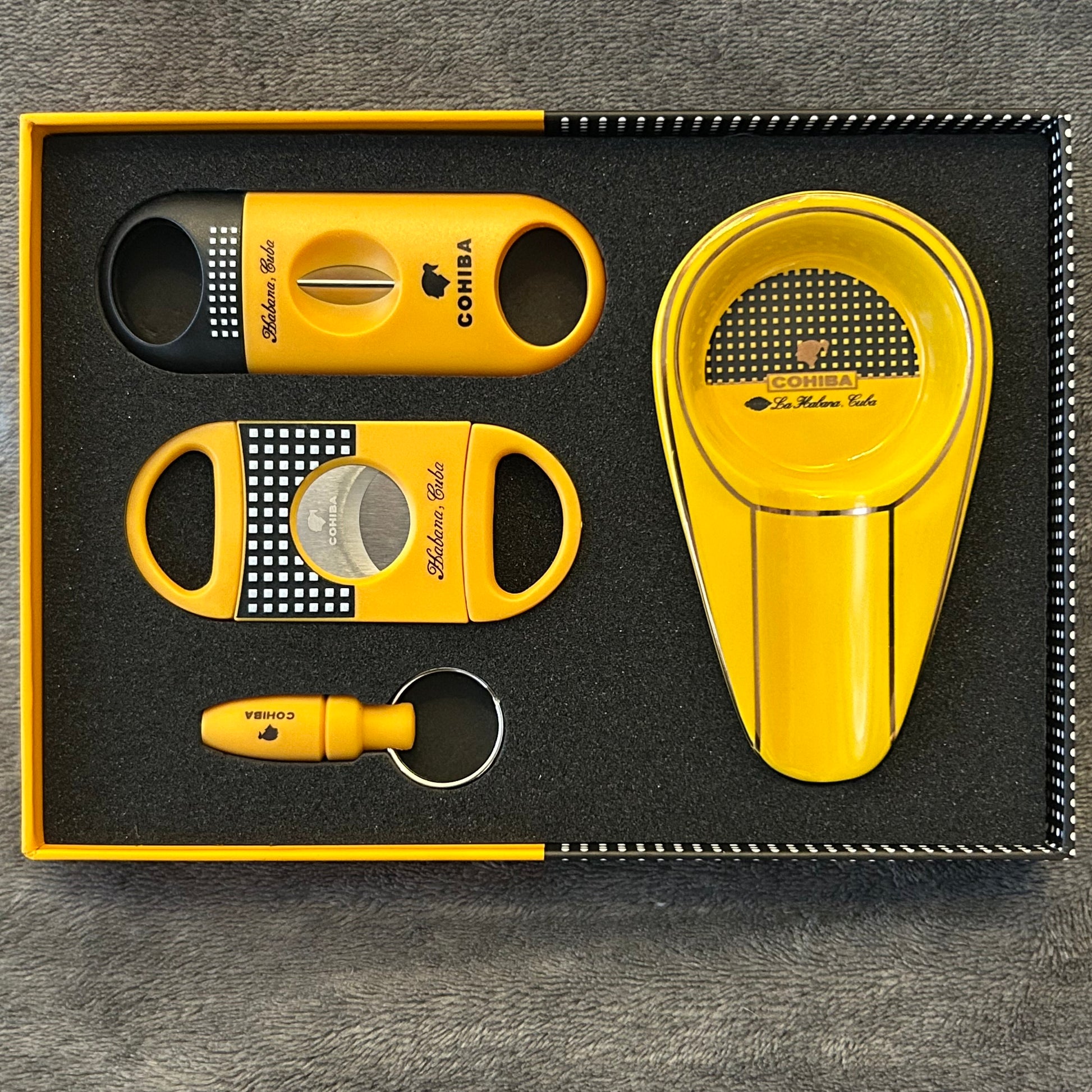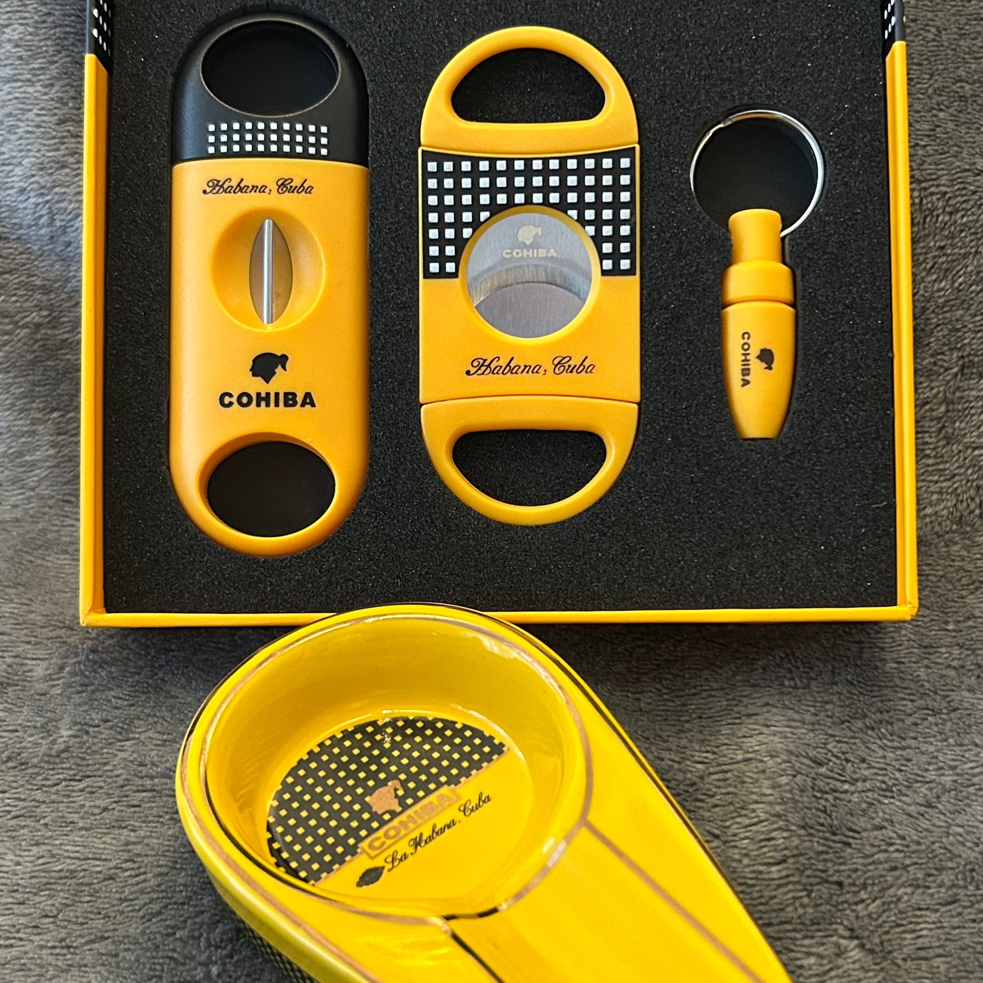 The Cohiba Box Set is a curated collection designed for the discerning cigar enthusiast. It includes a precision-engineered cigar cutter, a sharp v-cutter for clean cuts, a branded key ring, and a high-quality ashtray. Offered in classic yellow or black, this Cohiba duplicate set brings quality and style, ensuring a refined and complete cigar experience.
