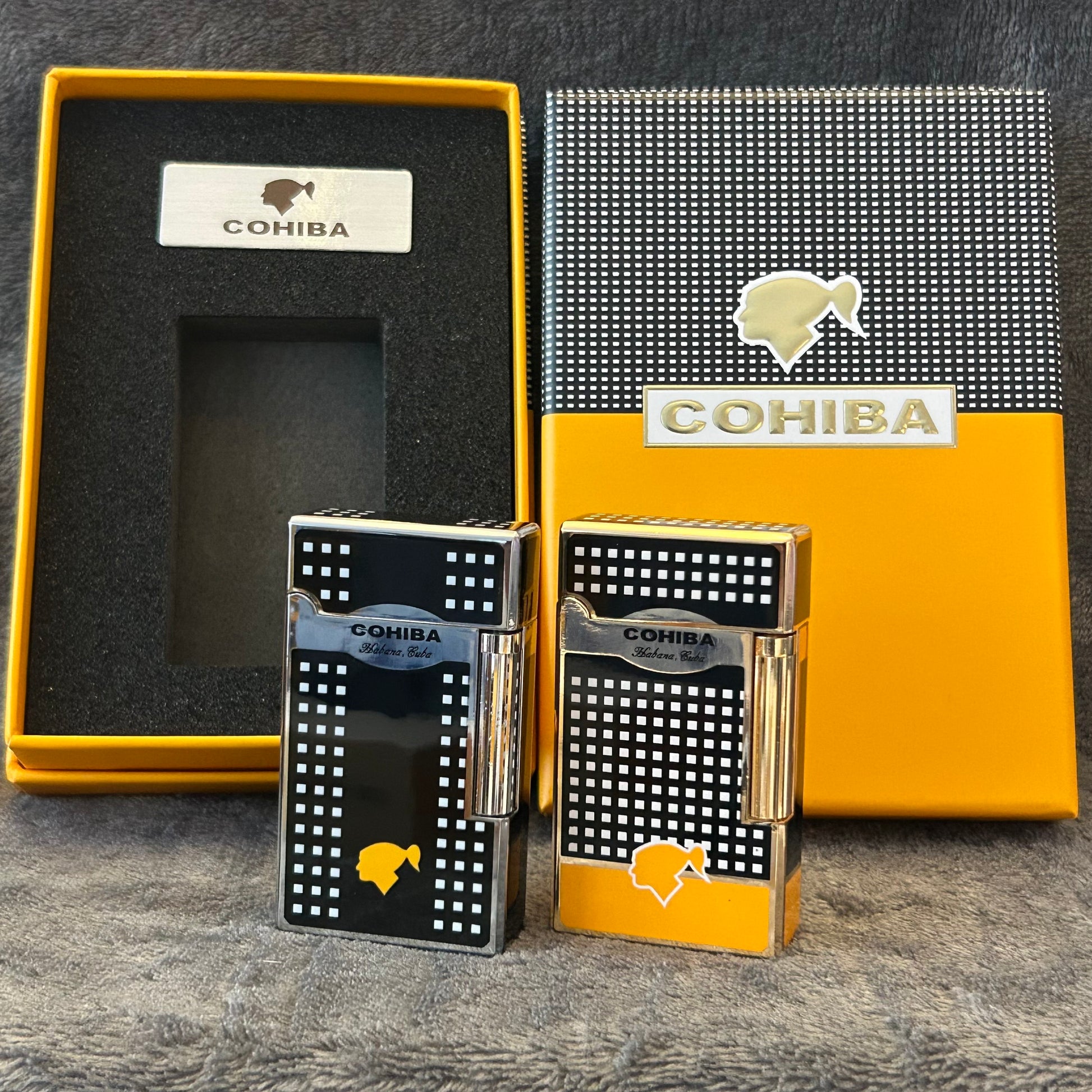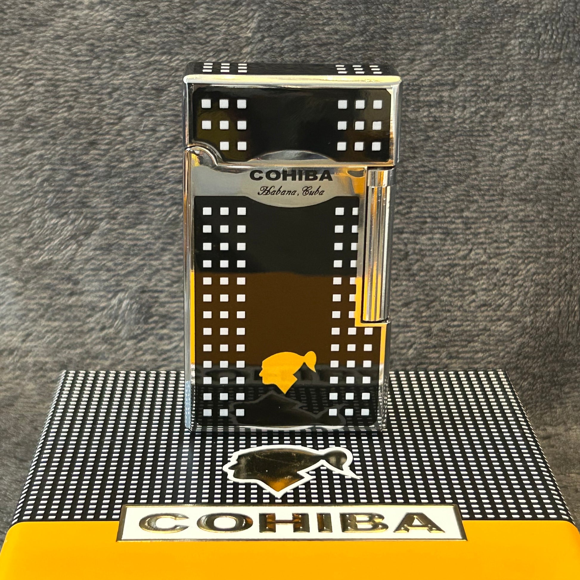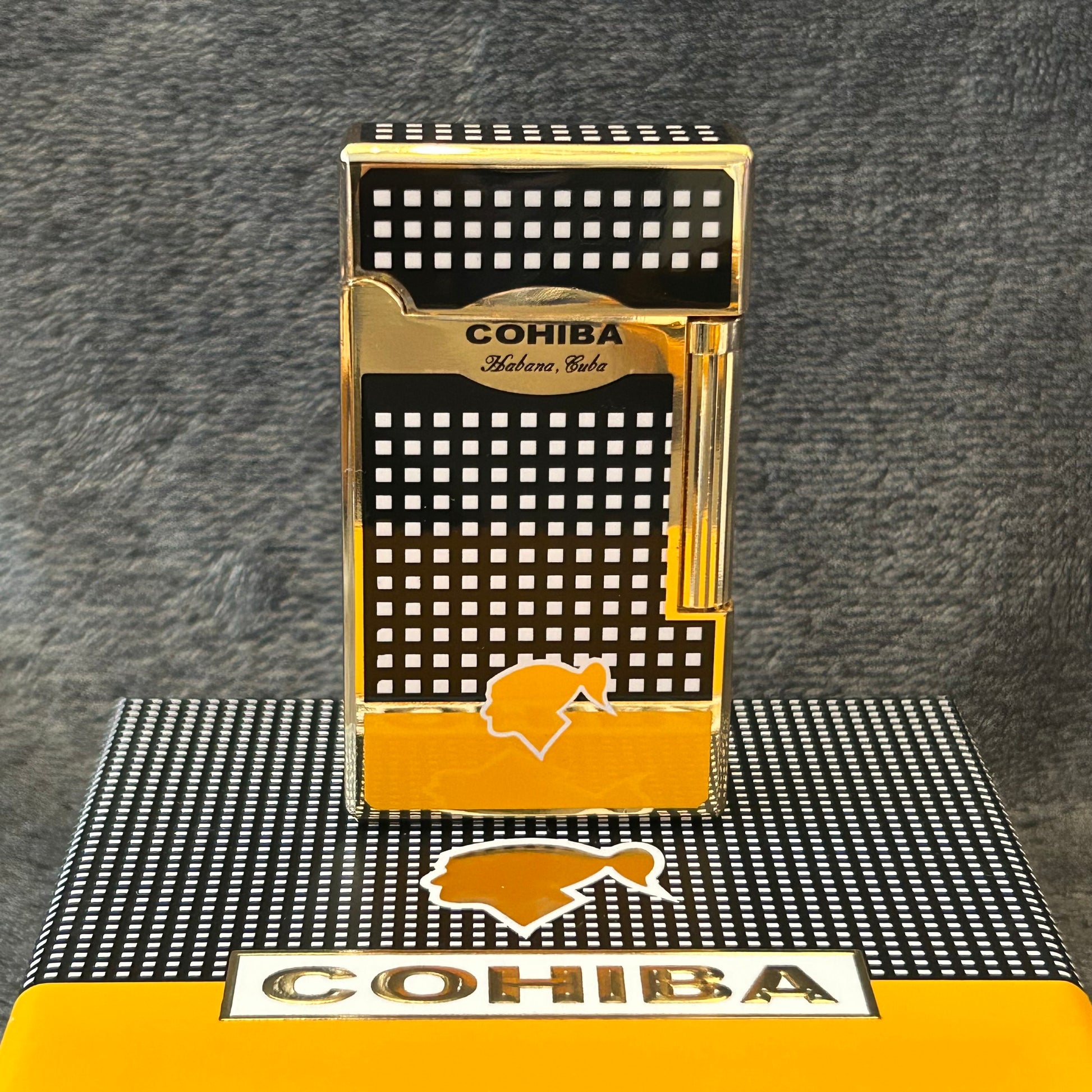 This Cohiba Lighter blends expert craftsmanship with iconic design, featuring the distinctive Cohiba pattern in your choice of black or gold finish. Packaged in an elegant gift box, this lighter not only delivers reliable performance but also serves as a sophisticated conversation starter for cigar lovers and collectors alike.