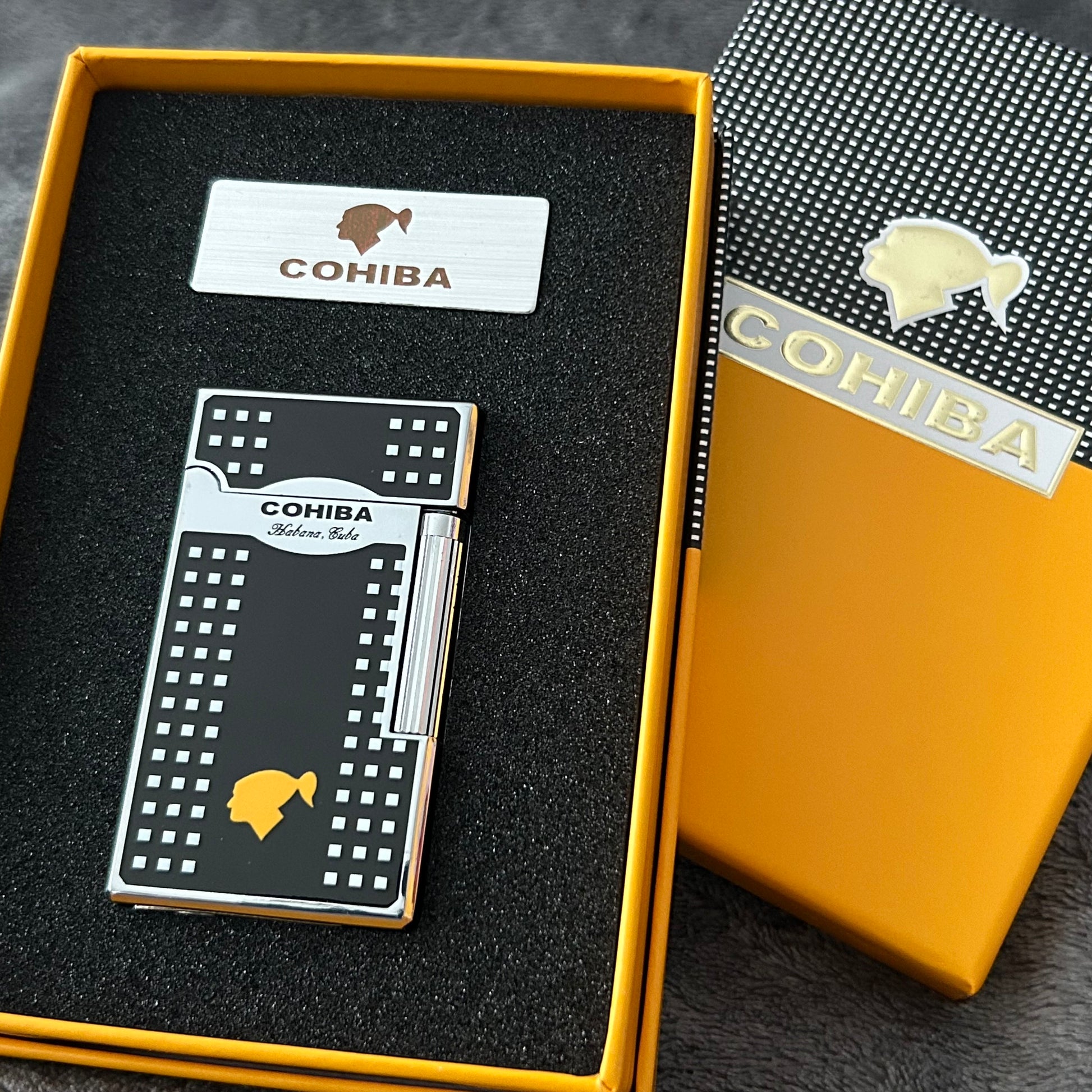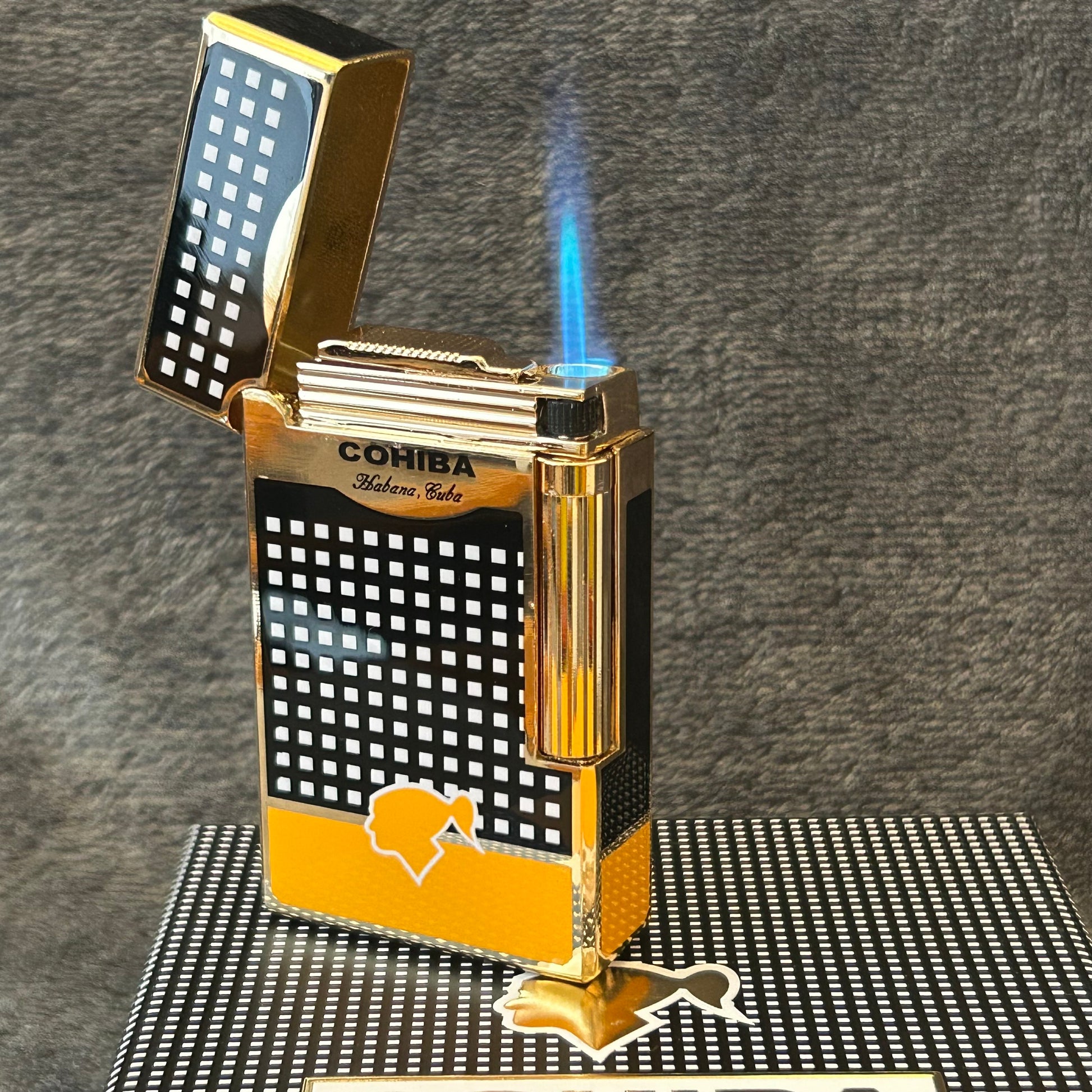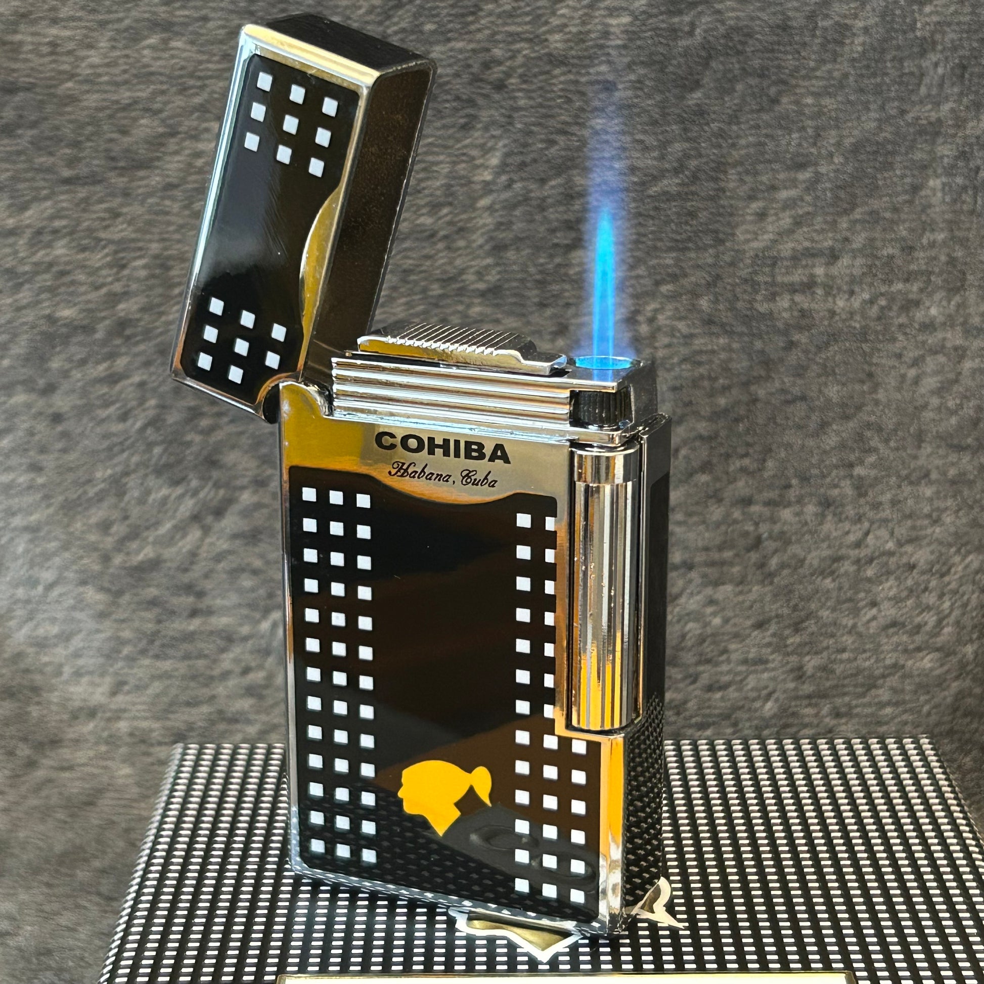 This Cohiba Lighter blends expert craftsmanship with iconic design, featuring the distinctive Cohiba pattern in your choice of black or gold finish. Packaged in an elegant gift box, this lighter not only delivers reliable performance but also serves as a sophisticated conversation starter for cigar lovers and collectors alike.